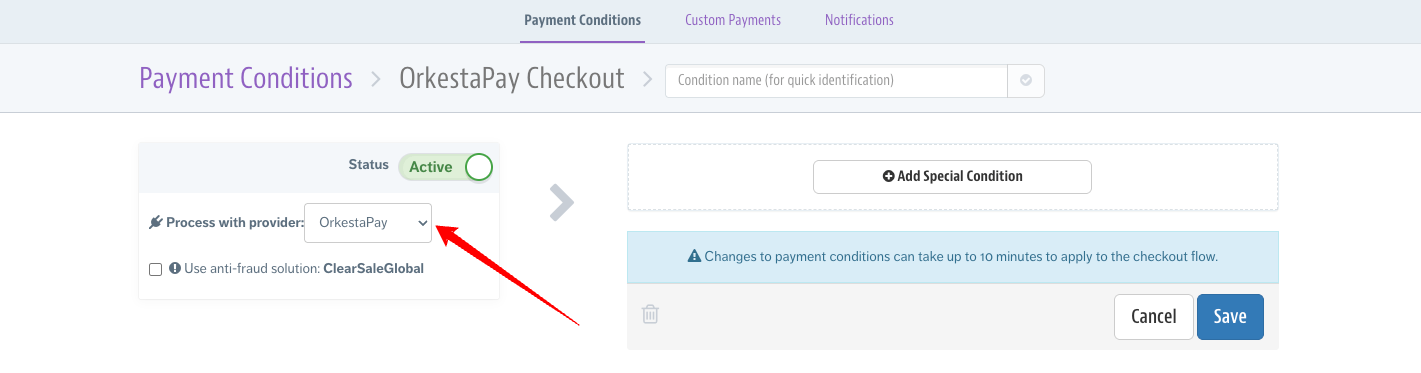 Una vez seleccionado, configura como proveedor al conector de OrkestaPay (paso 4.1) y da clic en Guardar.