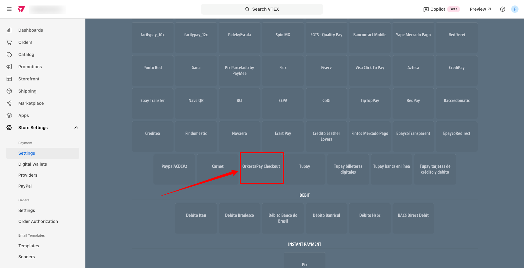 Dentro de tu portal de administración de tu comercio VTEX, selecciona la opción Store Settings > Payment > Providers.